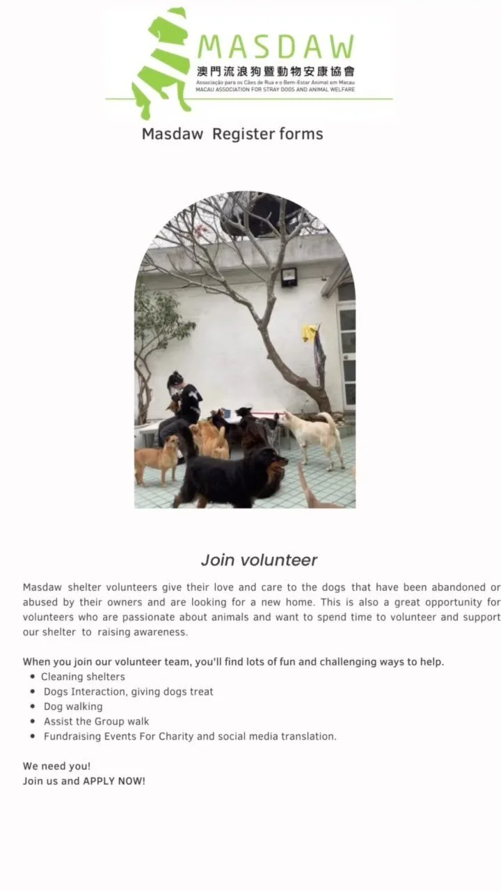 澳門流浪狗暨動物安康協會(Masdaw) 的主要使命是拯救流浪或被遺棄狗狗們,並積極地為他們尋找適合的安樂窩。同時,我們不斷推廣、教育及維護動物權益,並為他們爭取不同福利,讓澳門成為一個動物友好的城市。